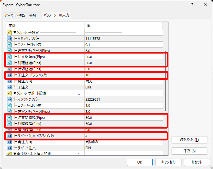 そのため、サイバーグルトレでは初期パラメーターの利確値幅を20pipsにしてあります。一般的なグルグルトレインのパラメーターを使いたい場合は、サイバーグルトレのパラメーターを参考にしてください。