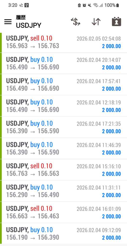 ニコニコマークが出たらあとは自動的に売買が行われるので、特に何もする必要はありません。このように自動的に取引が行われ、チャート上にマーク、取引ウィンドウに取引状況が表示されます。