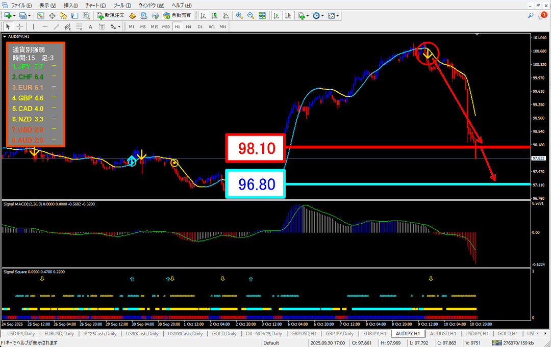 豪ドル円 97.82 下落 (1時間足)↓